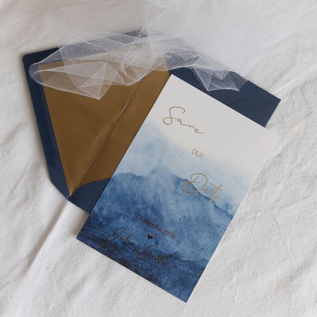 Klassieke save the date kaart met een overlopende blauwe watercolor afbeelding, gecombineerd met goudfolie. Een kaart met allure!