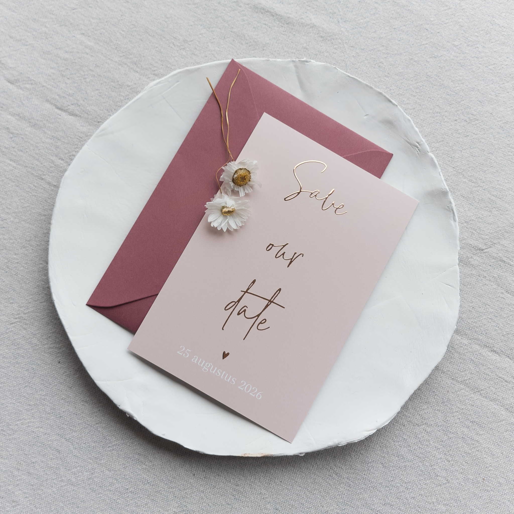 Deze zachtroze save the date kaart gebruik je bij de summer chic trouw huisstijl. Samen met de trouwkaart en de programma kaart kun je er een complete huisstijl van maken. Voor inspiratie kun je kijken op de pagina met huisstijlen of de pagina met pocketfolds. Hier zie je complete sets waar je zelf je onderdelen uit kunt halen. Heb je hier hulp bij nodig, dan kun je me altijd een berichtje sturen!