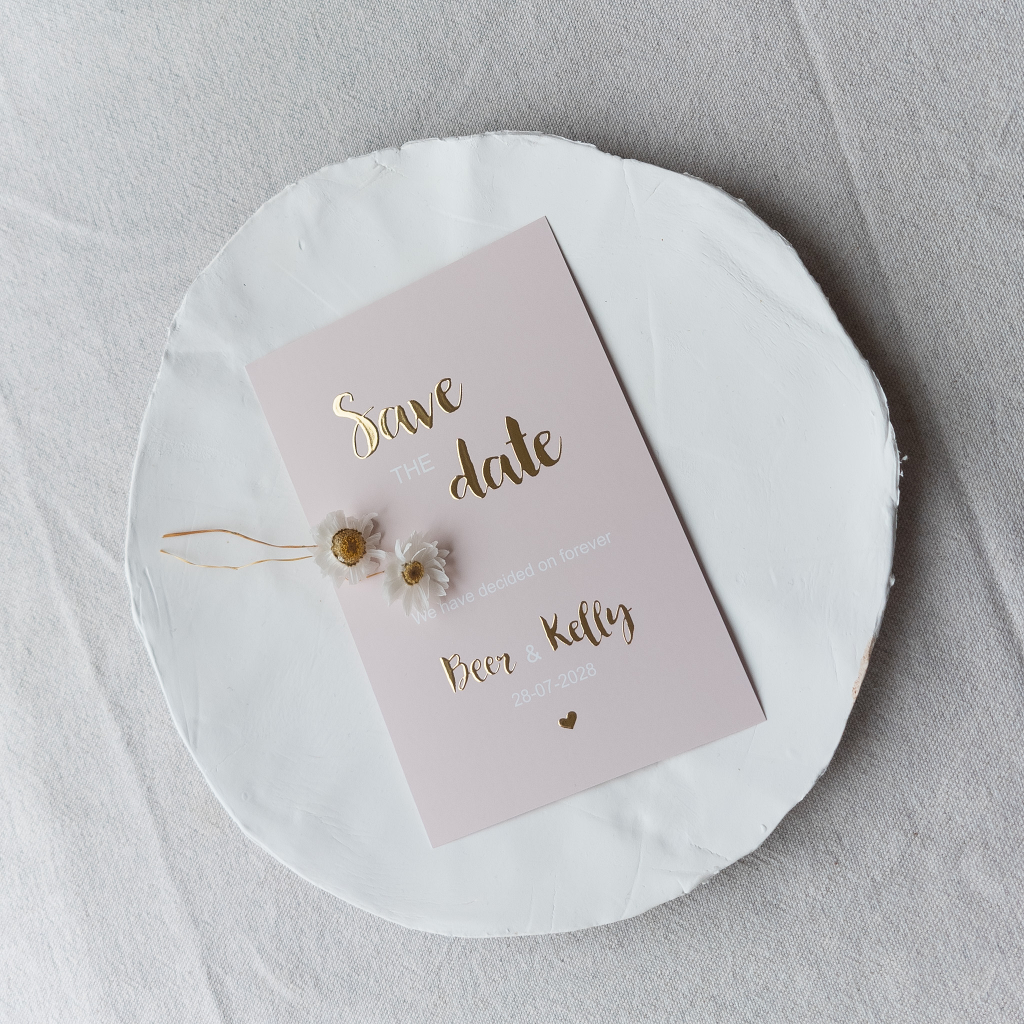 Minimalistische save the date kaart die je nog helemaal zelf naar wens kunt aanpassen. Misschien toch liever een andere kleur? Of een ander lettertype? Zo aangepast! Stuur een berichtje als je hier hulp bij wilt.