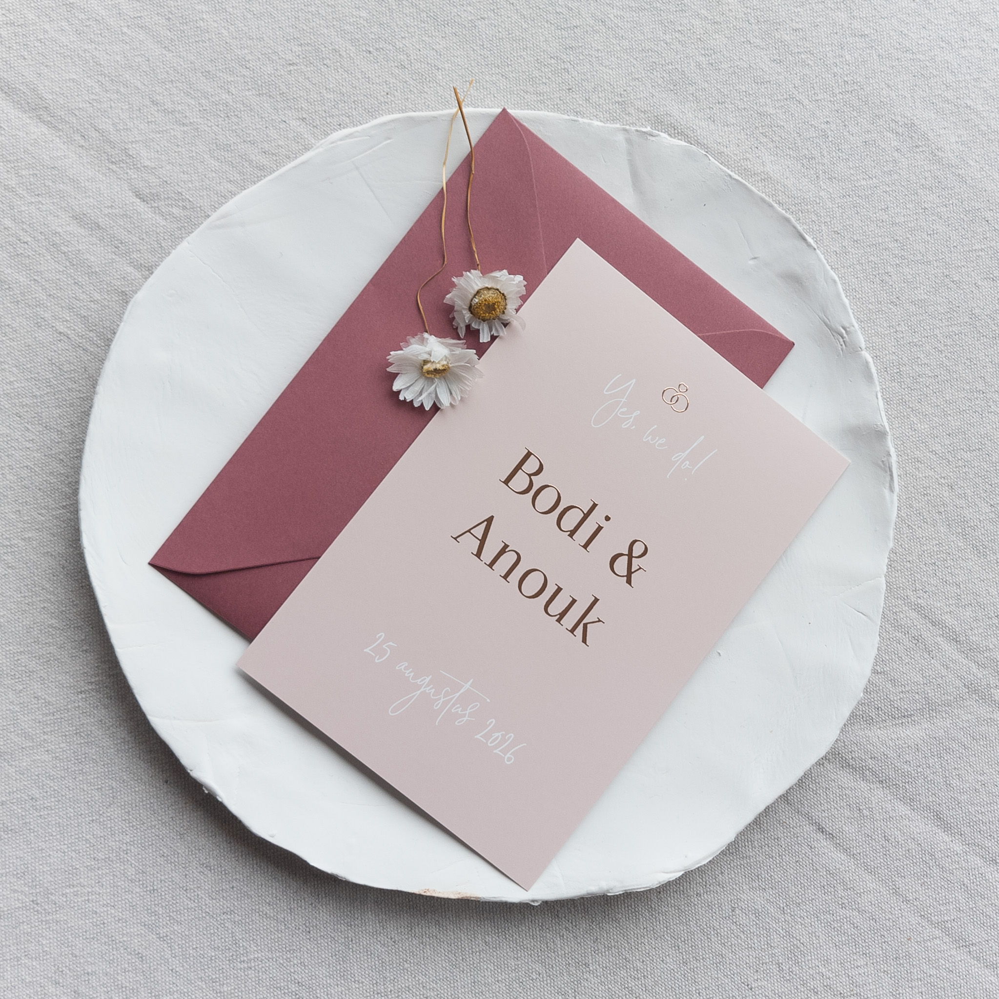 Trouwkaart zachtroze met wit en rosefolie