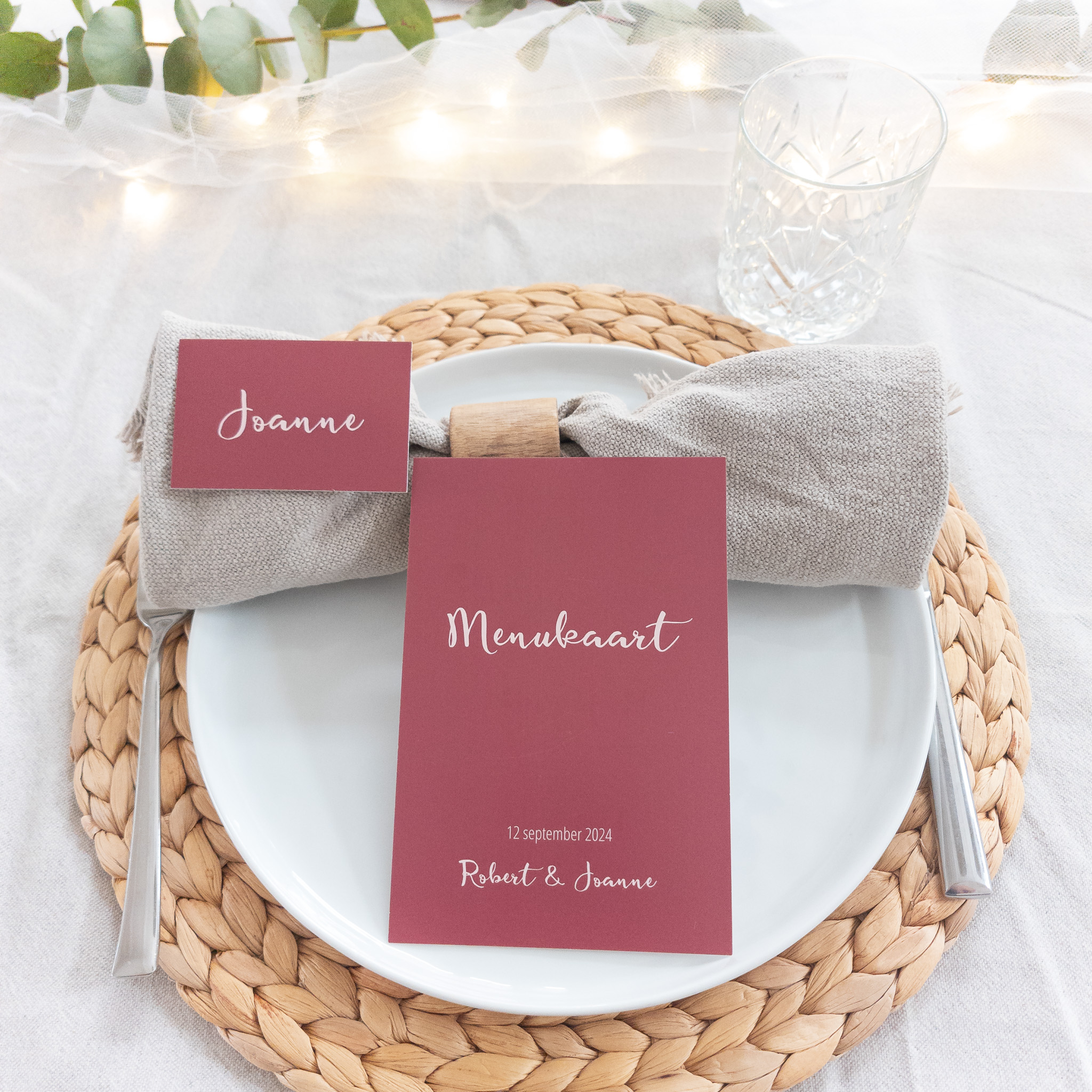 Menukaart in prachtige warme kleur, te combineren met de serie in pocketfold van Robert en Joanne. Vind je het lastig om een set samen te stellen? Ik help je graag! In deze serie zijn ook labelkaarten gemaakt zodat je een complete set kunt samenstellen.