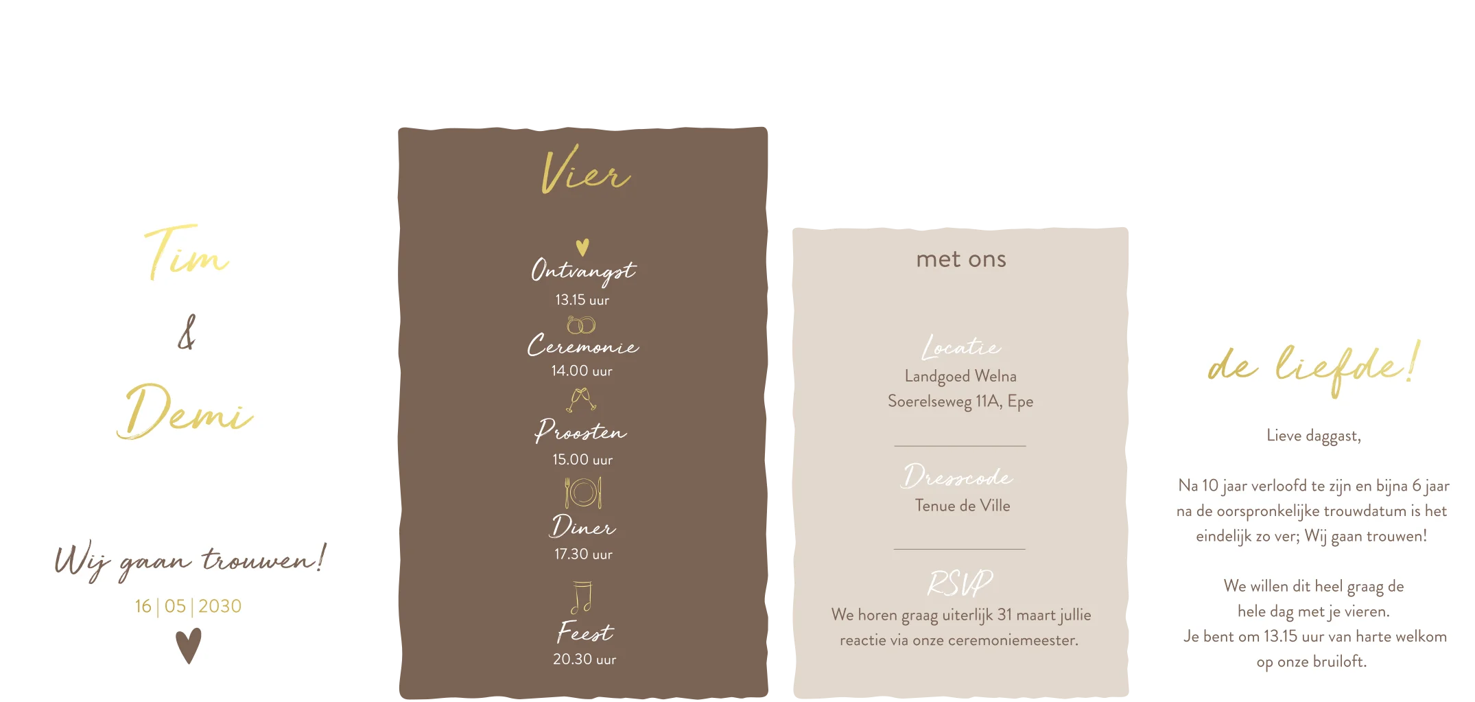 Trouwkaarten set in warme bruine tinten gecombineerd met een mooie cloud grey pocketfold. De kaarten hebben een handgeschept look rand, een grillige vorm die echt wat extra's toevoegt aan deze set.