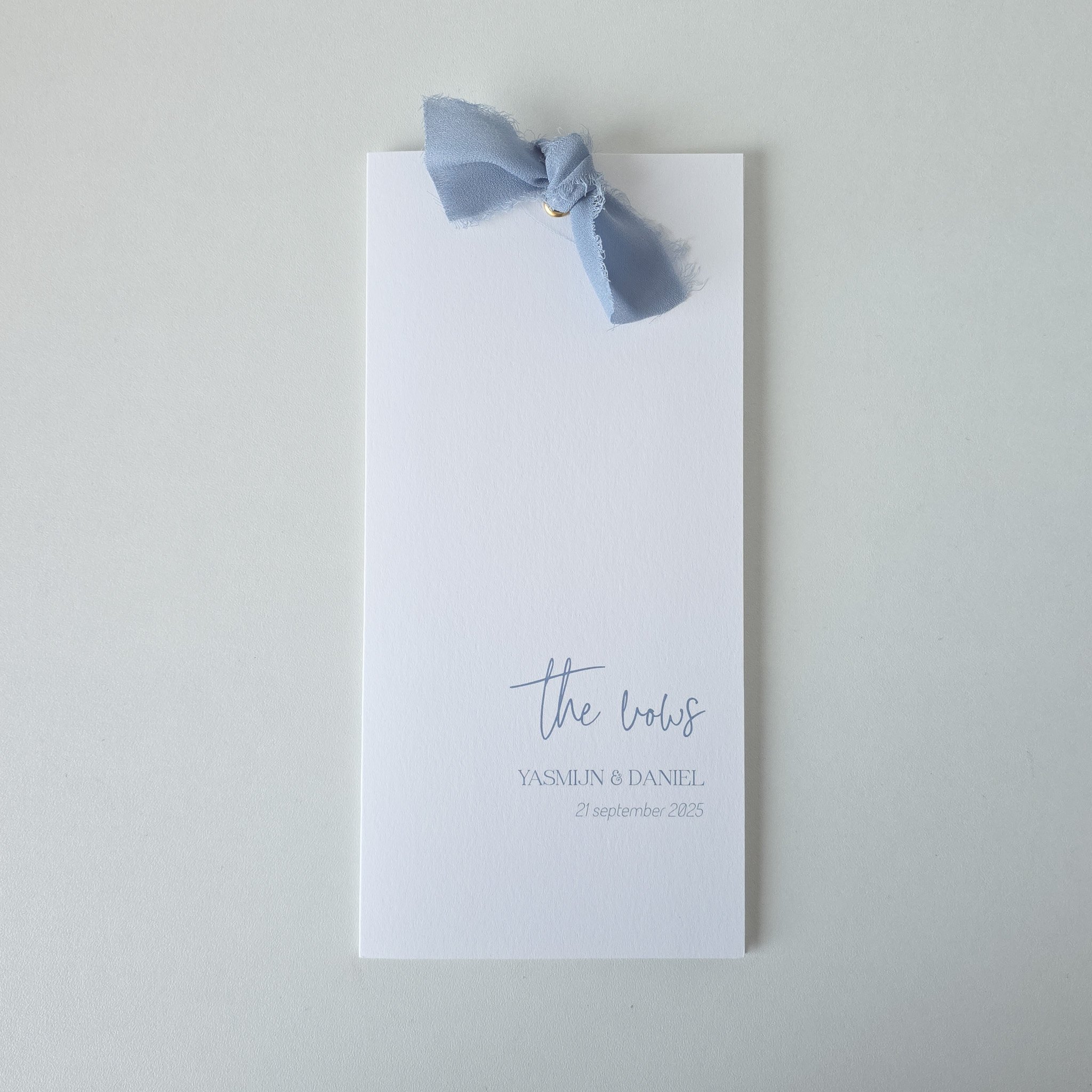 Eenvoudig en daardoor stijlvol geloftenboekje in wit met blauwe tekst. Vul aan met het mooie blauwe zijden lint (15 cm) de flenstang en de ringetjes, welke je nog apart bij bestelt. Knip een gaatje in het midden van de kaart en knijp het ringetje er in. Daarna strik je het lint er door heen met slechts een enkele knoop.