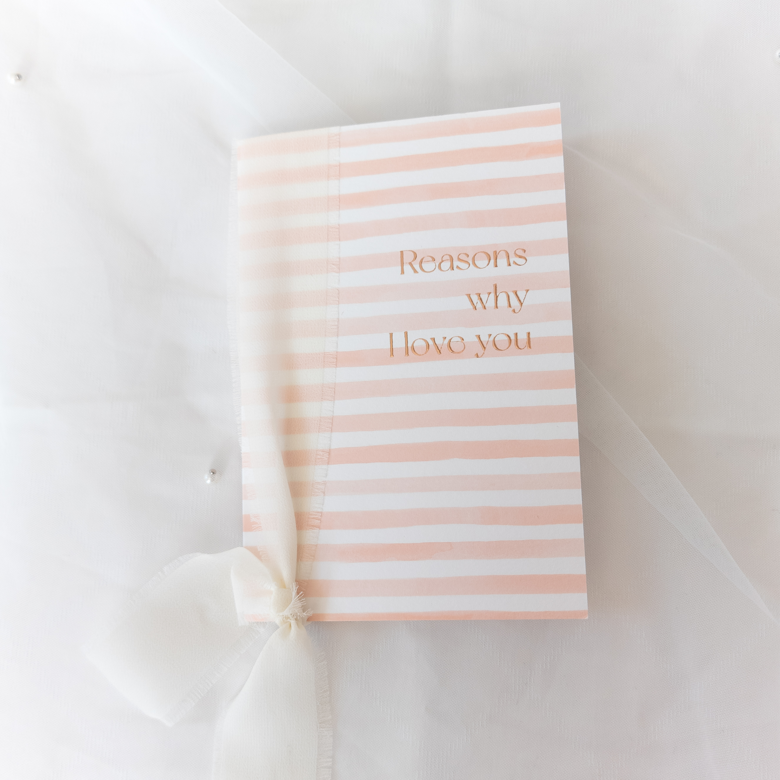 geloften boekje voor de bruid met blush watercolor strepen en roséfolie accenten. Passend bij de trouw huisstijl Silly stripes! Wil je er lint omheen zoals in het voorbeeld? Ik gebruikte 60 cm ecru zijden lint.