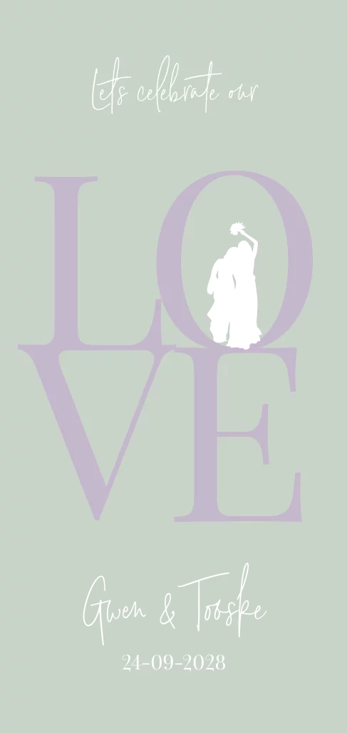 Op zoek naar een unieke trouwkaart in een prachtige lavendel groen en goud kleurenpalet? Zoek niet verder! Onze trouwkaart in groen, lila, wit en goud is perfect voor een feestelijke en stijlvolle aankondiging van jullie grote dag. Het ontwerp is aanpasbaar naar jullie eigen kleurenpalet, zodat het perfect aansluit bij jullie persoonlijke smaak en stijl.