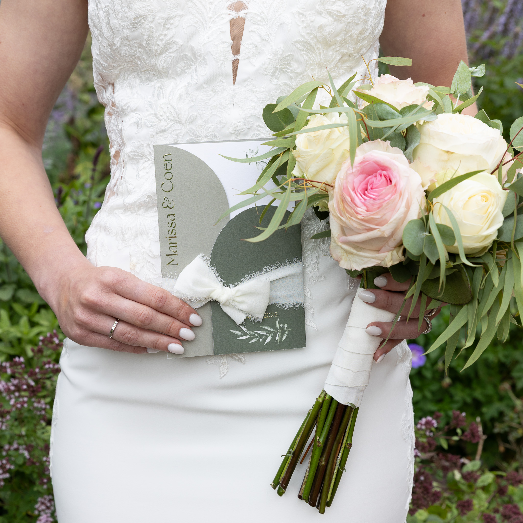 Trouwkaart met olijftakken en chique details in goudfolie. De kaart is 11x17 cm zodat hij mooi in het bijpassende insteekmapje past die ook in de trouw huisstijl Olive green zit. Deze bestel je er nog los bij.