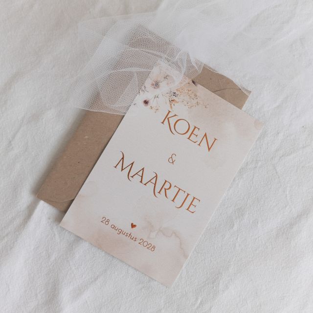 Klassieke trouwkaart met een zachte, beige watercolor afbeelding, gecombineerd met roséfolie. Prachtig op linnen papier! In deze wedding stationery vind je nog veel meer onderdelen, zoals een save the date, een programmakaart, sluitstickers, een welkomstbord en een gastenboek.