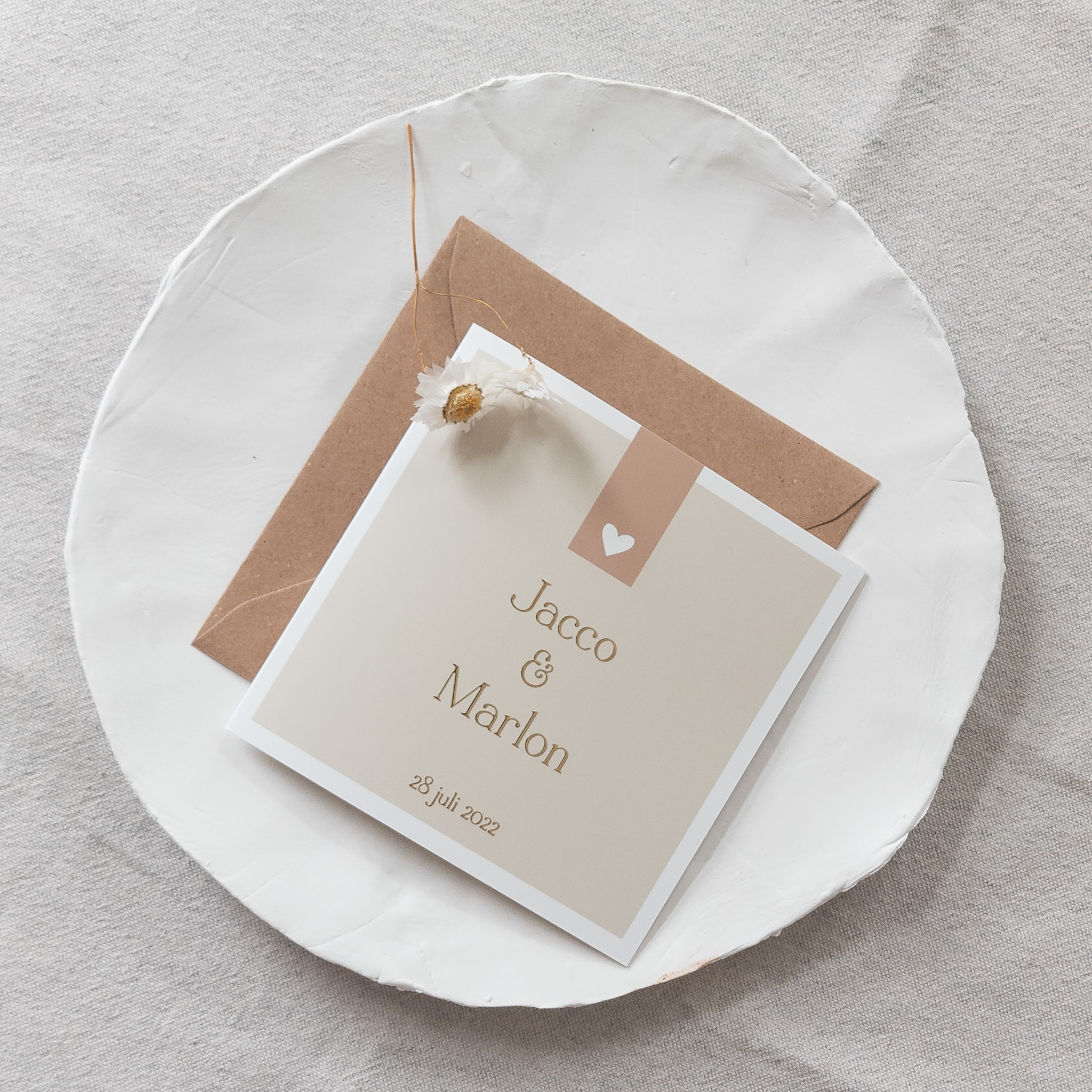 Trouwkaart beige zand met goudfolie