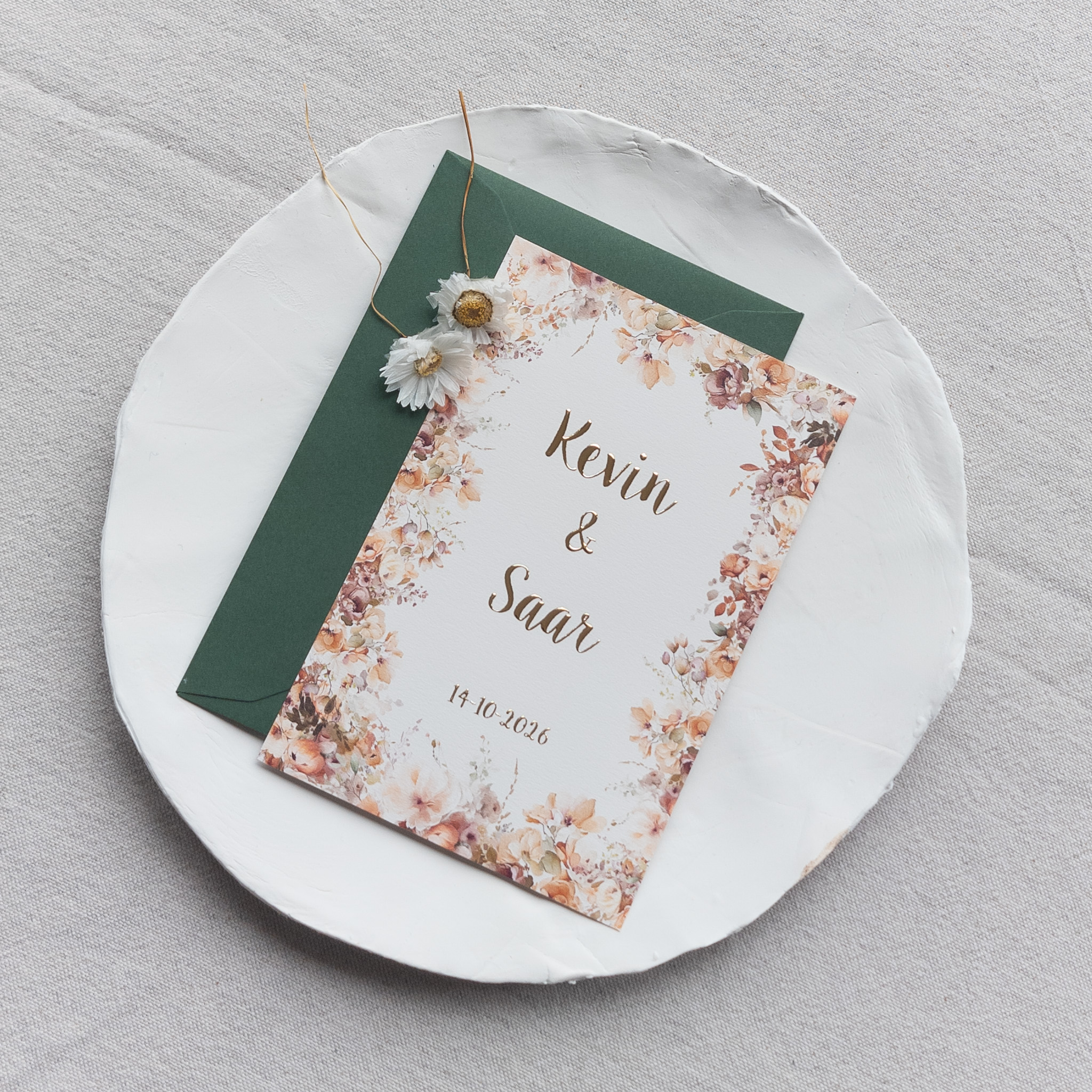 Trouwkaart bloemenrand met goudfolie
