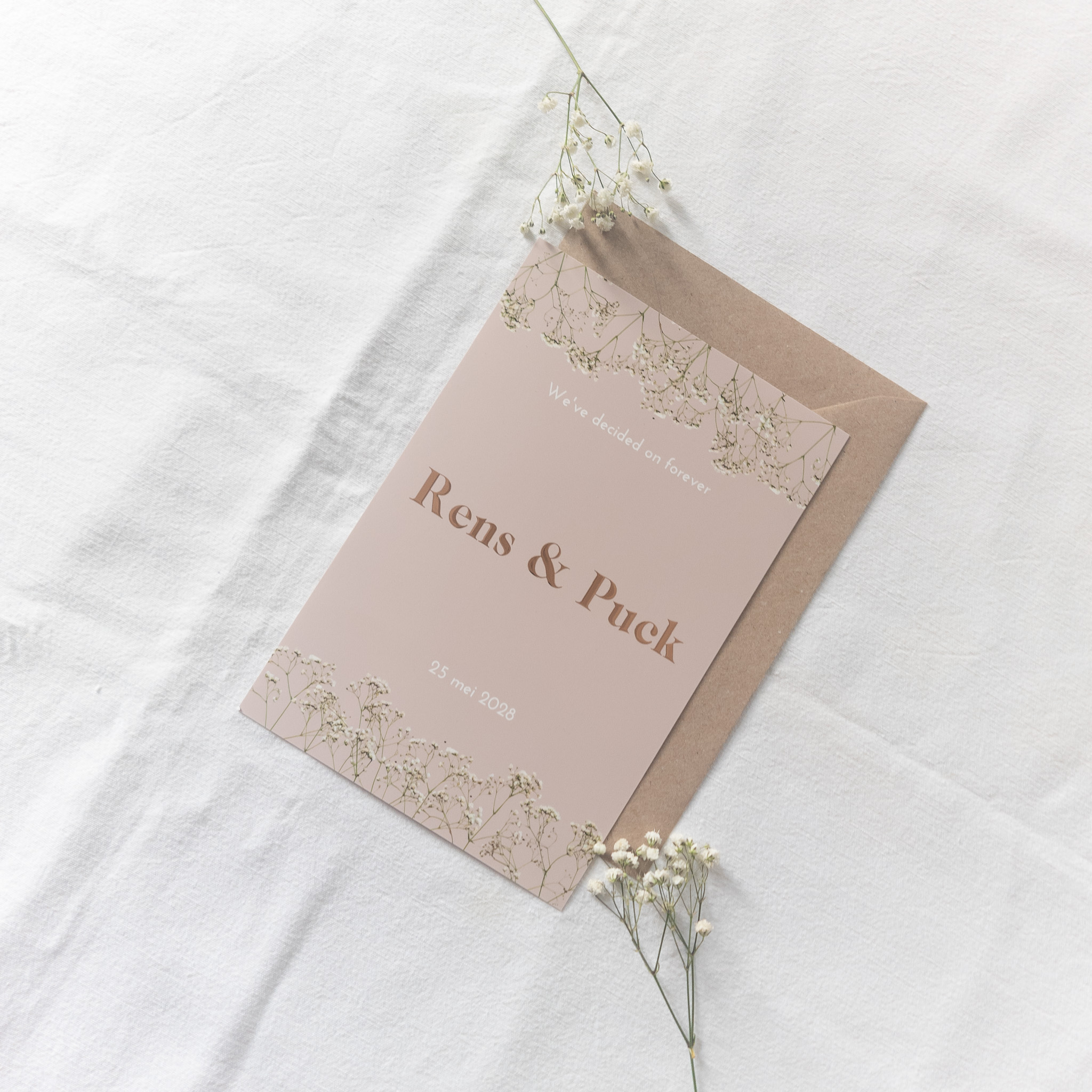 Trouwkaart in prachtige warme kleur, met gipskruid afbeeldingen. De namen in roséfolie kleuren prachtig bij de achtergrond kleur. Maar natuurlijk kun je dit allemaal zelf aanpassen! Wil je graag een complete huisstijl en vind je het lastig om een set samen te stellen? Ik help je graag! Stuur me een berichtje en ik kijk met je mee.