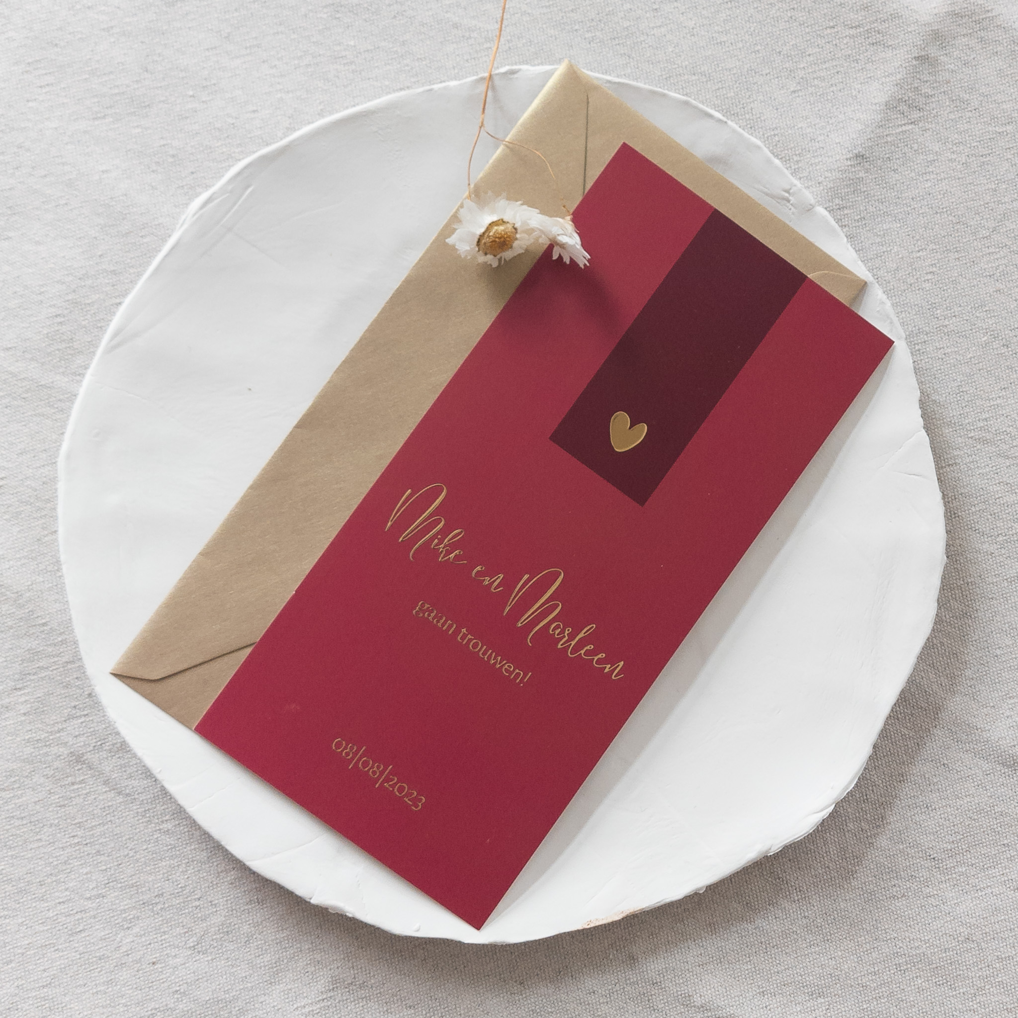 Trouwkaart in 2 kleuren bordeauxrood met goudfolie en hartje