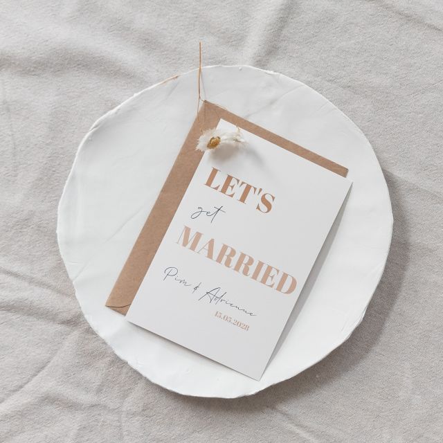 Passend bij de save the date in bruintinten. De kleurcombinaties en typografie maken deze kaart!