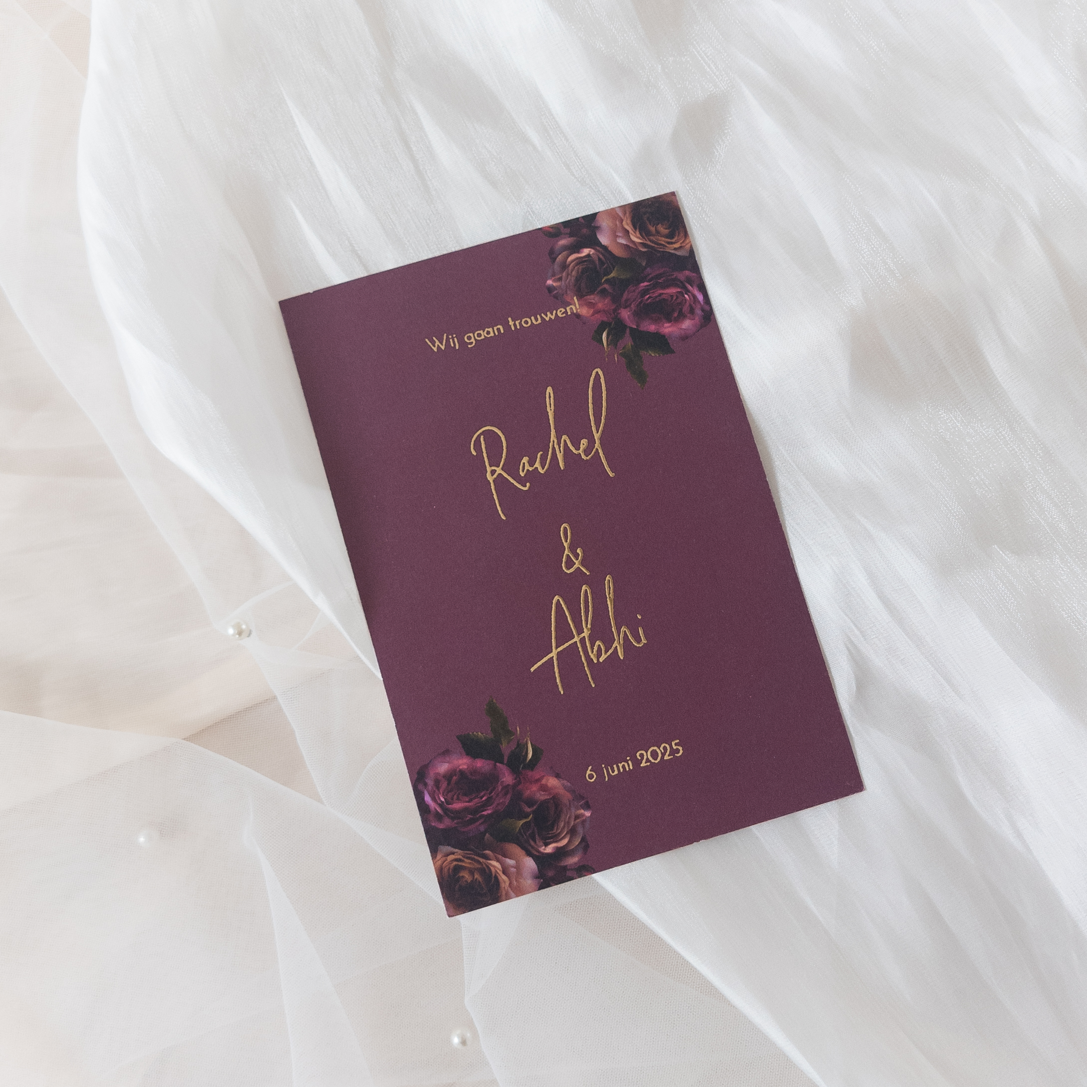 Chique trouwkaart in bordeaux kleurstelling met goudfolie. De bloemen geven extra stijlvolle details aan de kaart en deze kaart combineert prachtig met de kalkpapier omslag met bordeaux bloemprint!