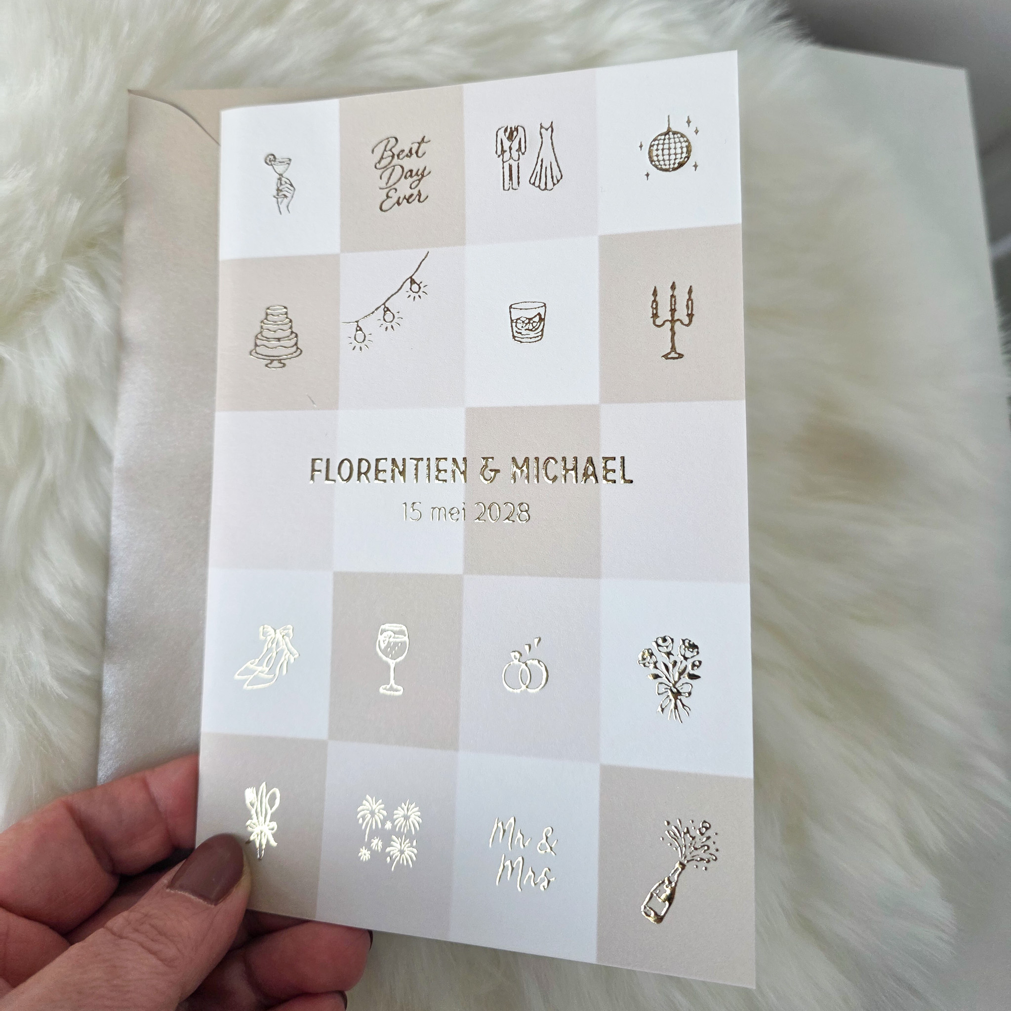 Trouwkaart geblokt goudfolie