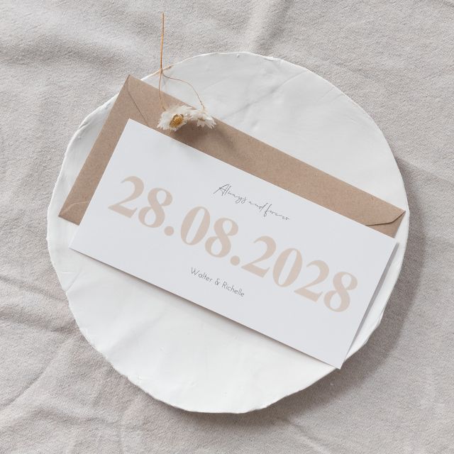 Chique en eenvoudige trouwkaart met hoogglans lak in een prachtige beige tint. Door de achterkant in 2 delen op te breken, kun je er lekker veel tekst op kwijt voor alle informatie over jullie grote dag!
