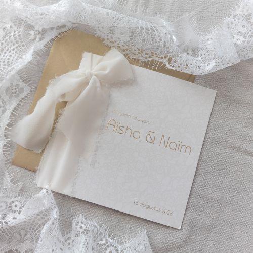 Klassieke trouwkaart met een print van kant die je in elke gewenste kleur kunt aanpassen. Ook vind je in de beeldbank meer kanten achtergronden. Prachtig met ons lint! Ik gebruikte 75 cm lint in het voorbeeld.
