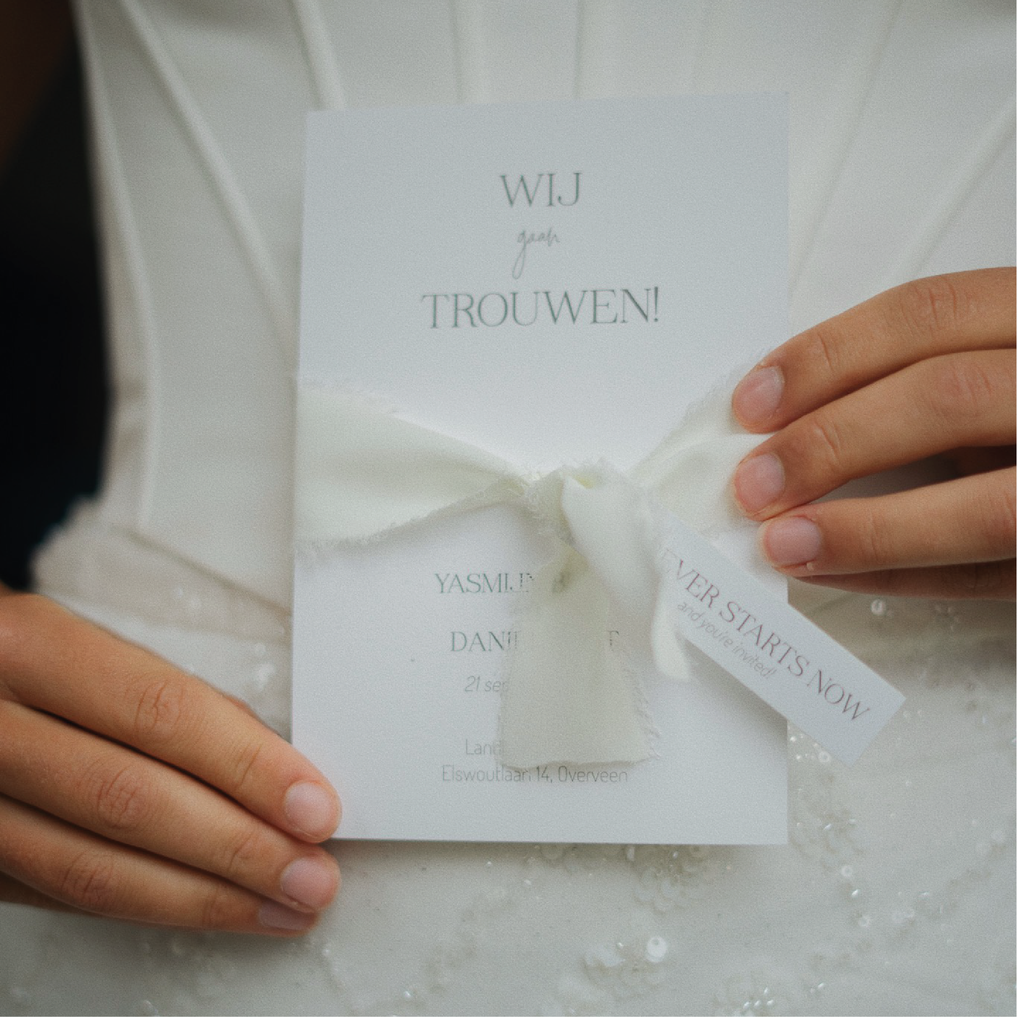 Trouwkaart met lint, kalkomslag en gipskruid