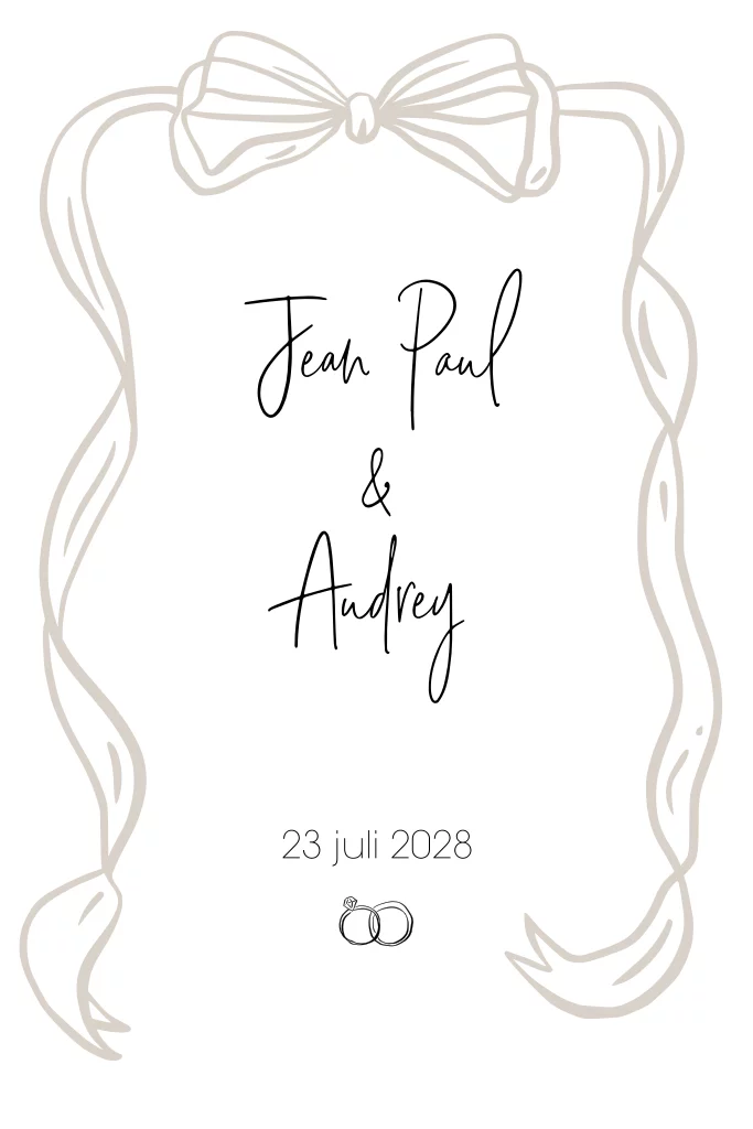Op zoek naar een trendy trouwkaart die perfect past bij jullie stijlvolle bruiloft? Ontdek onze prachtige trouwkaart met beige gedrapeerde strik. Met een eigentijds ontwerp in wit, beige en zwart, is deze kaart een echte eyecatcher. Het striklint in een trendy beige print is helemaal in lijn met de laatste trends. Bovendien kun je de kaart volledig aanpassen naar jullie eigen kleurenpalet en lettertype, en zelfs foliedruk toepassen voor een extra luxe uitstraling. Of jullie nu een bruiloft plannen in de lente, zomer, herfst of winter, deze klassieke trouwkaart past perfect bij elk seizoen. De rustige uitstraling in combinatie met de klassieke elementen maakt deze kaart geschikt voor diverse bruiloftsthema's. Of jullie nu kiezen voor een klassieke, moderne of juist een vintage bruiloft, deze trouwkaart past altijd.