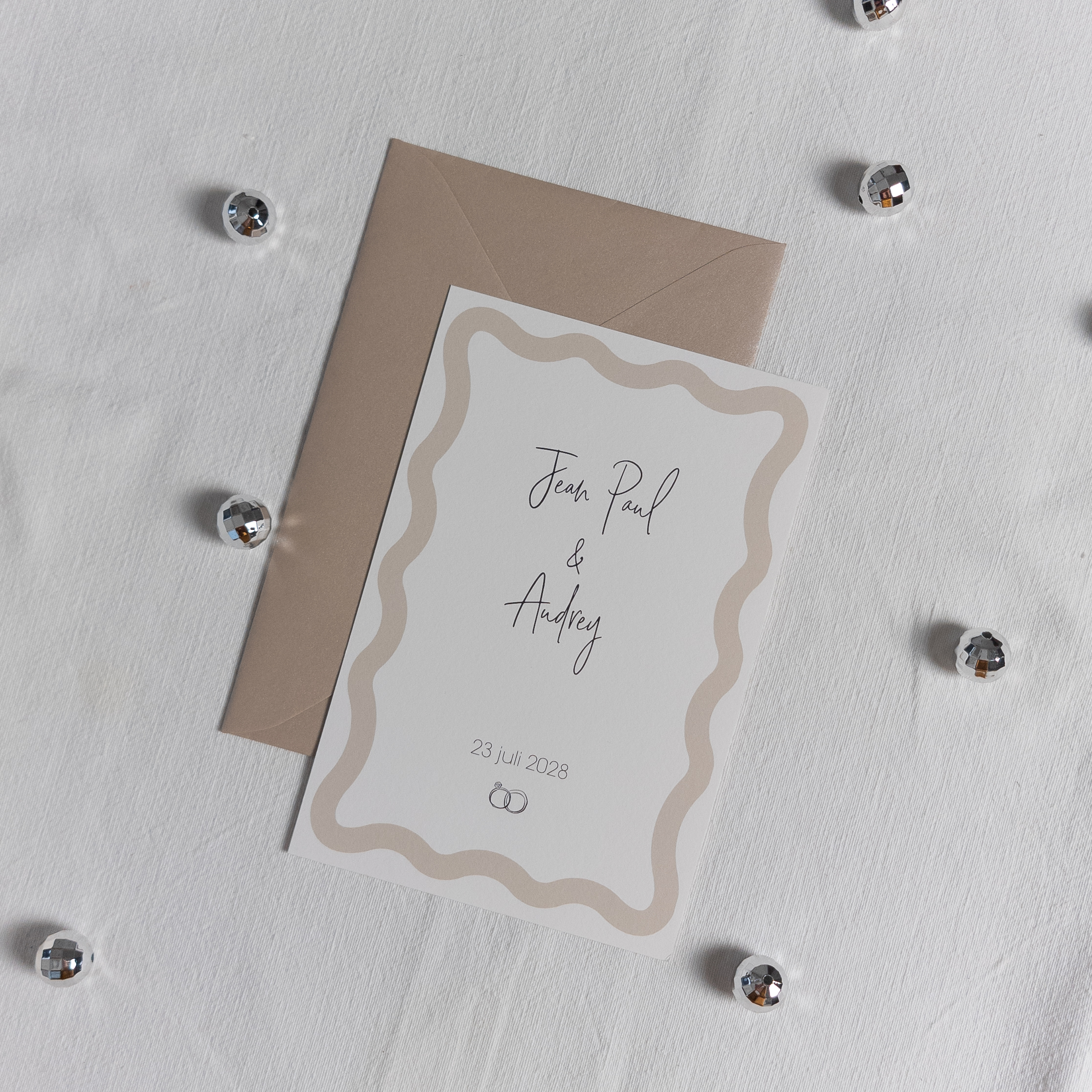 Trendy trouwkaart in wit, beige en zwart. De wavy lijn is helemaal van nu! De kaart kun je naar wens aanpassen naar je eigen kleuren palet en eventueel kun je foliedruk toepassen. Jean Paul en Audrey