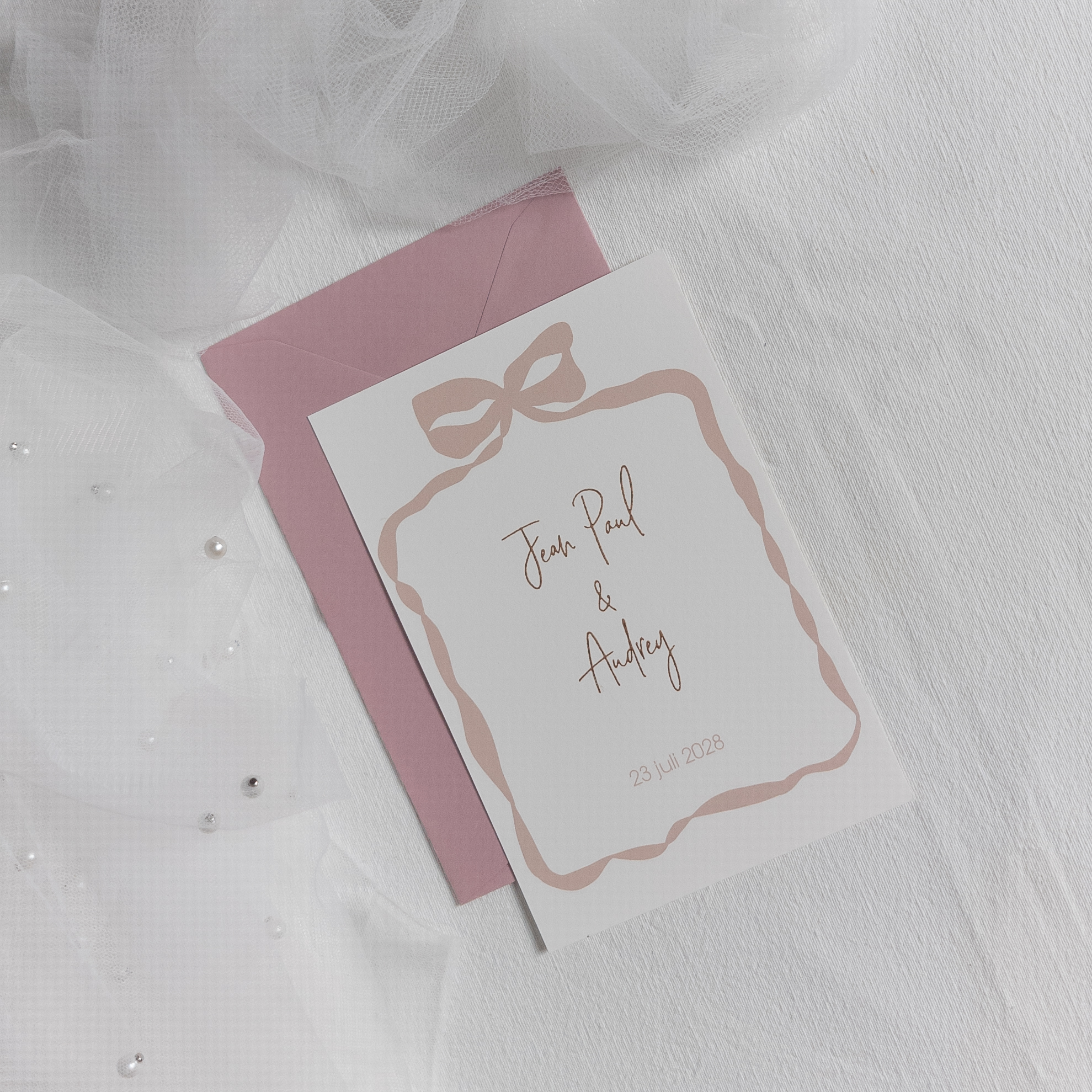 Trouwkaart met blush strik kader en rosefolie