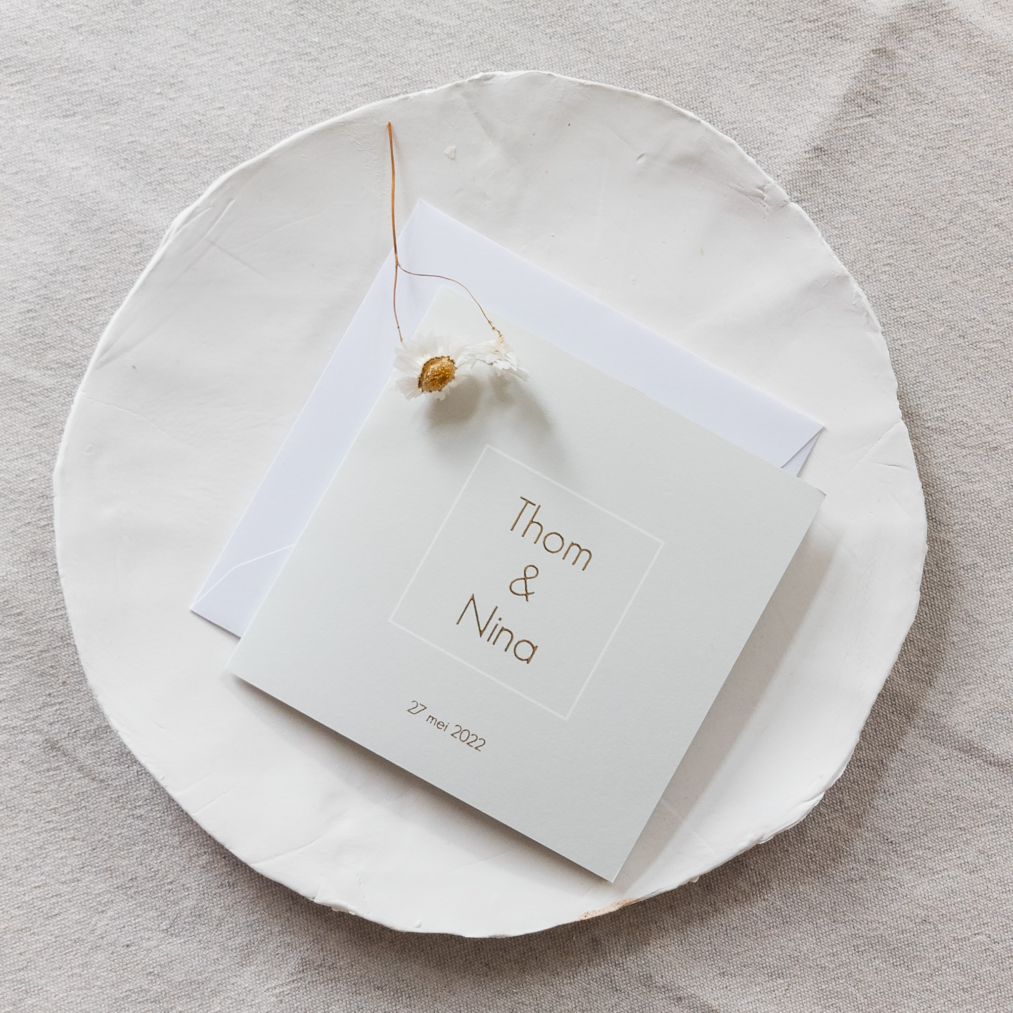 Strakke en eenvoudige trouwkaart in mint kleur. Natuurlijk is deze kleur aan te passen naar wens. En vind je tweezijdig foliedruk teveel? Je kunt er ook voor kiezen om de binnenkant met witte tekst te bedrukken. Of de binnenkant achtergrond wit te maken en de tekst weer in mint groen. Bestel altijd een proefdruk, zo zie je de kaart hoe hij wordt in het echt.
