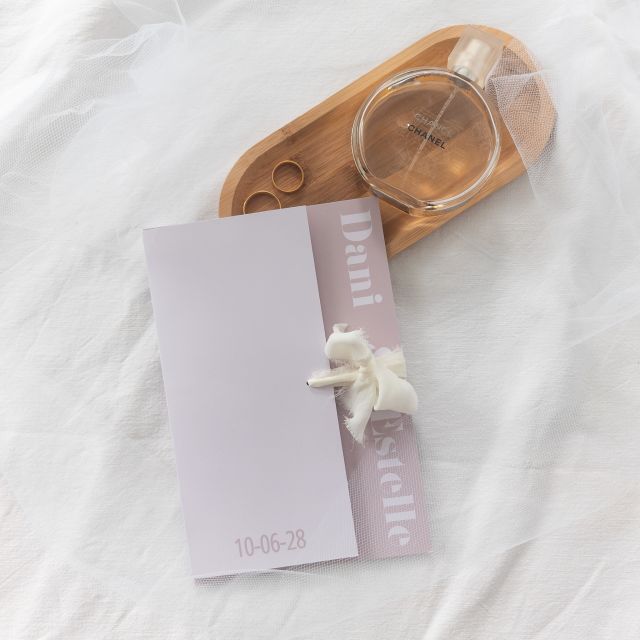 Deze dubbele langwerpige trouwkaart in 21x10 cm hoort bij de trouwkaart "ik pak je in". Samen maken ze 1 geheel. Je dient dus beide onderdelen te bestellen om deze kaart compleet te maken. Op de kaart is een zwart gaatje op alle pagina's afgebeeld. Hier kun je geen tekst plaatsen als je hem wilt gebruiken zoals in het voorbeeld. Je knipt hier zelf met de perforator een gaatje, zodat je het bijbehorende lint er doorheen kunt halen om deze exclusieve en stijlvolle trouwkaart samen te binden. Voor dit voorbeeld gebruikte ik 15 cm lint. Het lint bestel je er apart bij via menu extra's >> lint.