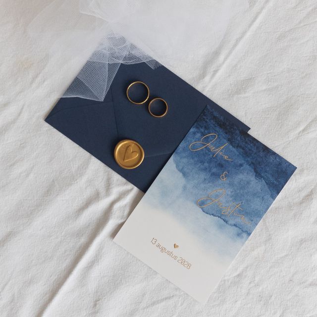 Klassieke trouwkaart met een overlopende blauwe watercolor afbeelding, gecombineerd met goudfolie. Een kaart met allure!