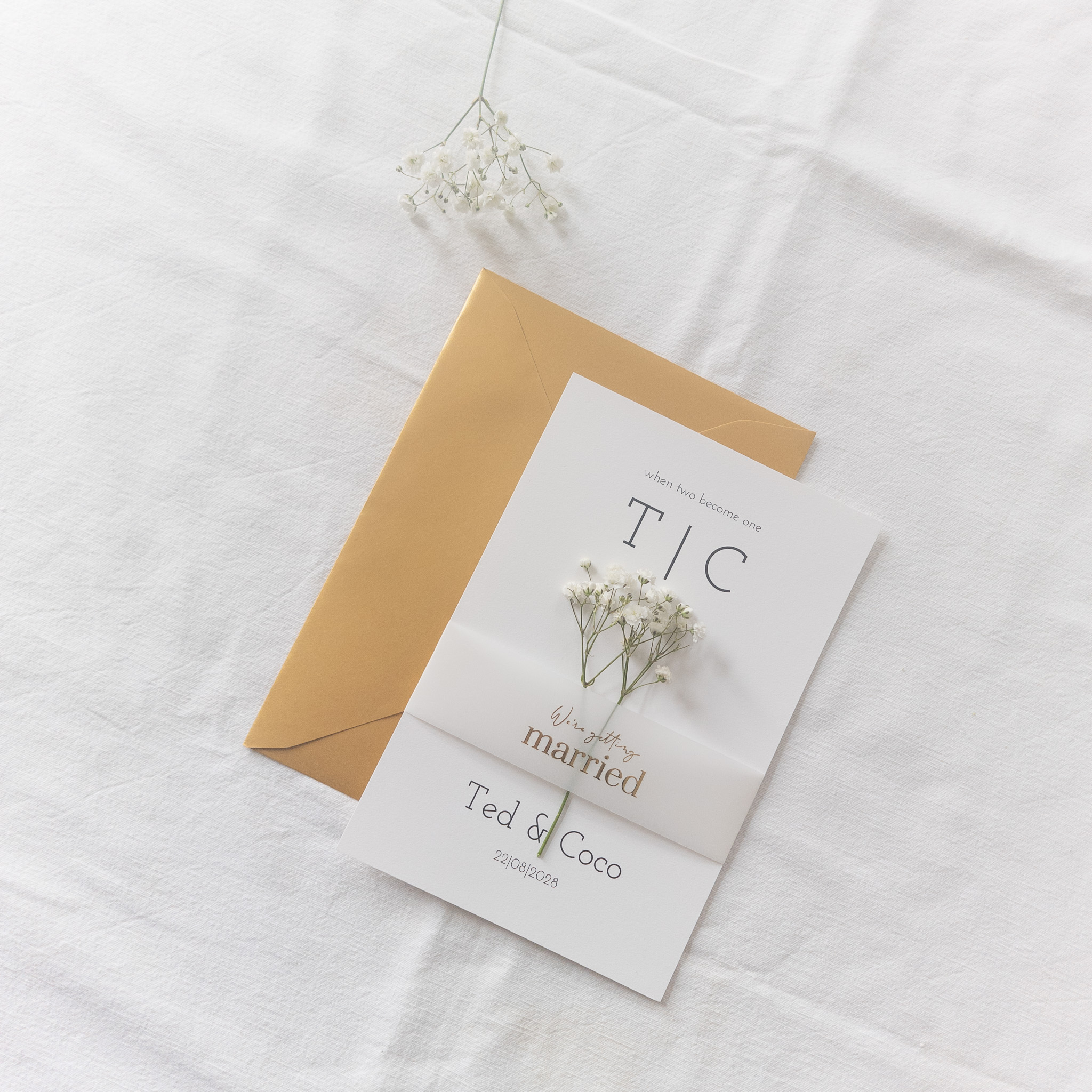 Super chique trouwkaart gedrukt op linnen papier met zwarte teksten. Versier deze kaart met lint of gebruik een kalkpapier wikkel. Steek daar een takje gipskruid tussen en je kaart is af! (Zonder is hij ook al heel mooi) Lint of kalkpapier wikkels bestel je er nog los bij. Het voorbeeld is gedrukt op 14x21, wat neerkomt op een half A4 formaat. Lekker groot dus!! De envelop die je dan nodig hebt is 22x15.6 cm.