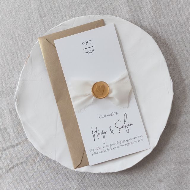 Gebruik je het lint zoals in het voorbeeld, dan heb je 35 cm per kaart nodig. In het voorbeeld zie je de waxzegel goud met hartje. Waxzegels hebben een zelfklevend stripje op de achterkant, super handig!